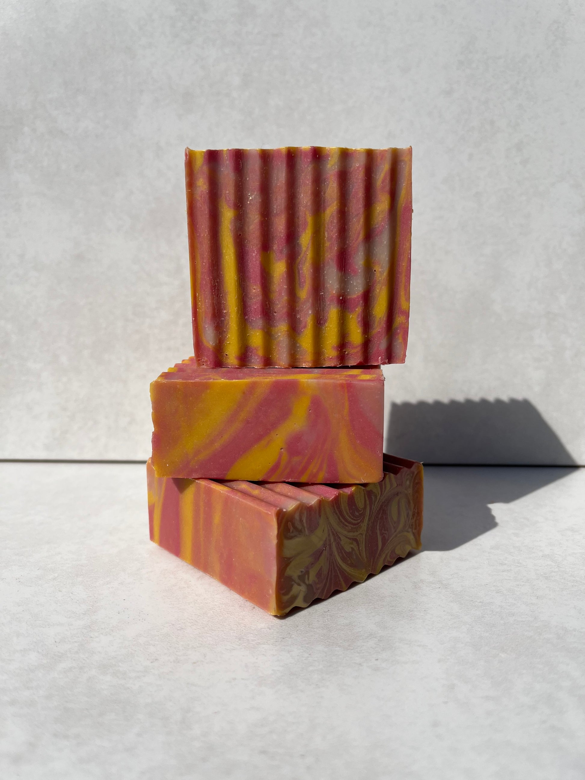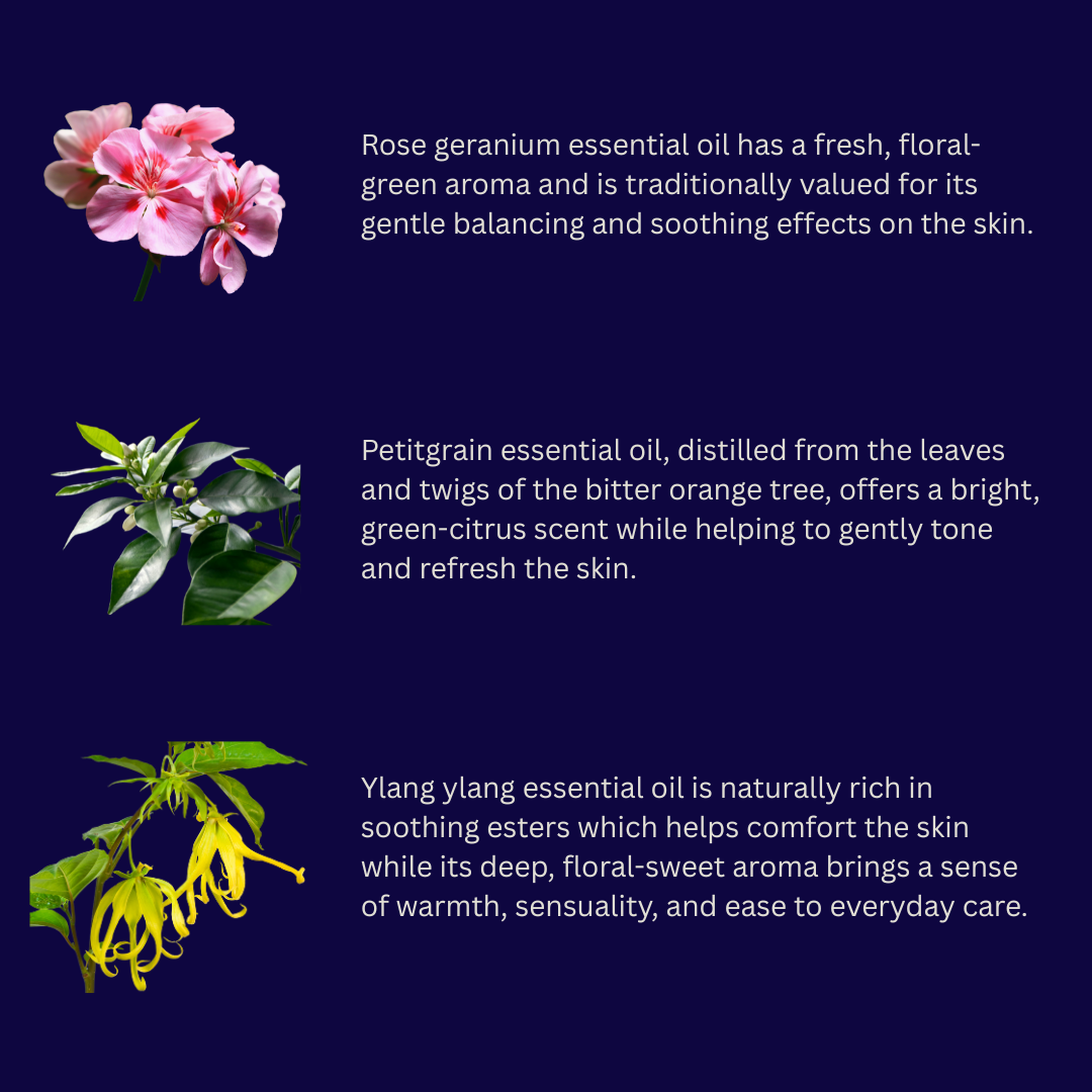 Experience the serenity of rain over new growth. This soap captures that moment with a green, dewy blend of Geranium and Petitgrain, finished with the velvety smoothness of Ylang Ylang and Vanilla.